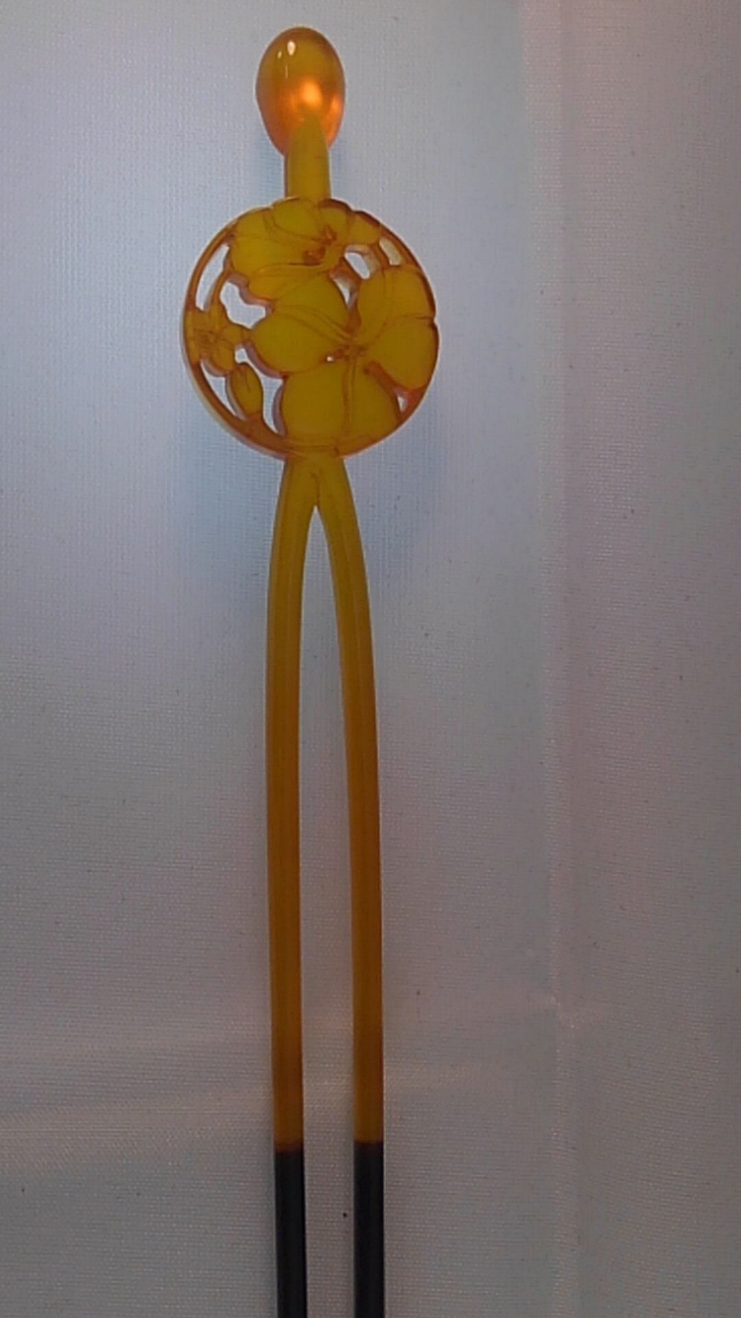 三つ葉の彫刻がきれいなかんざしです。上部のみみかきと呼ばれる部分に丸みを持たせ2本足の部分はほぼ完全な円筒状に削り出されています。